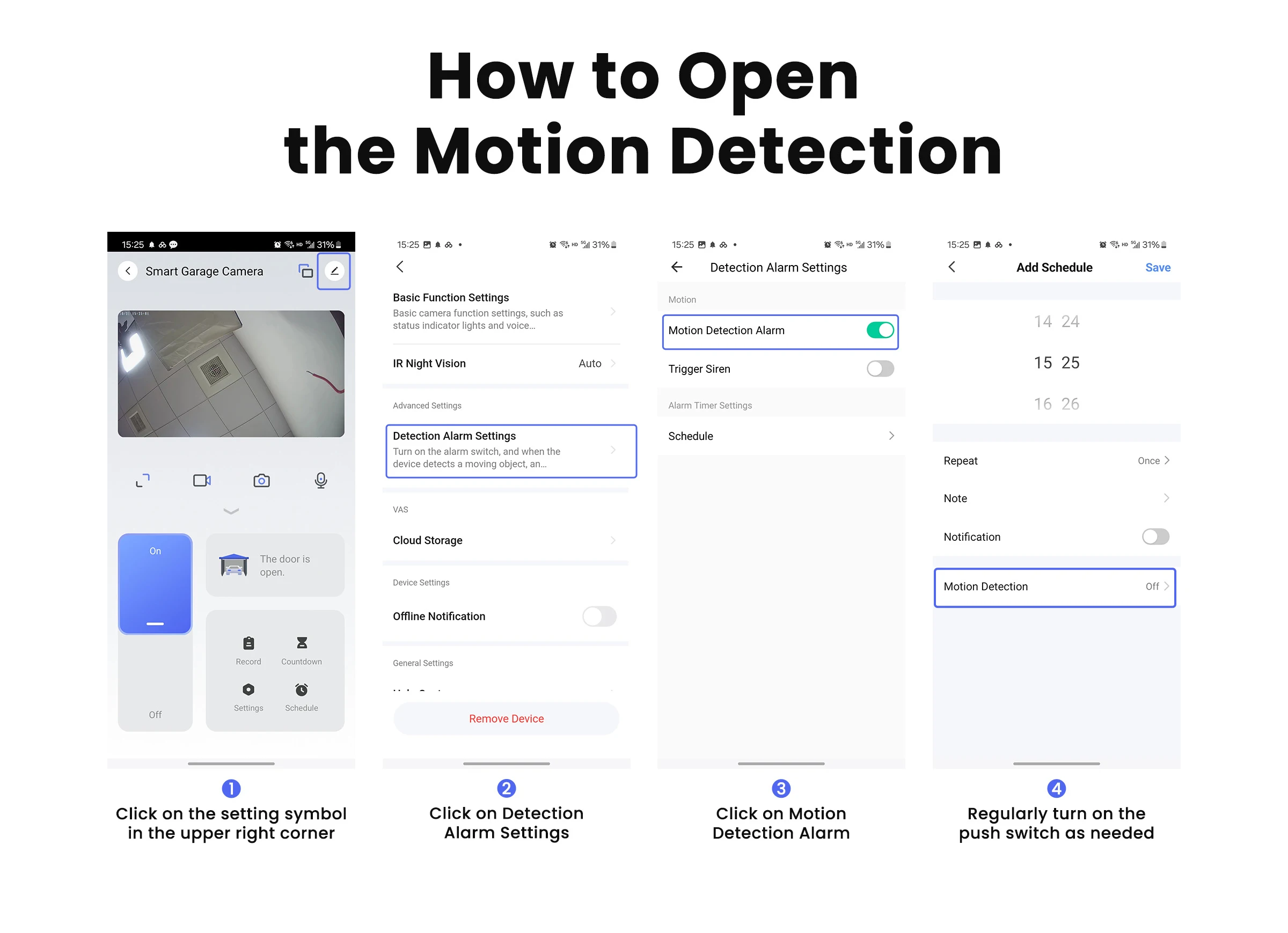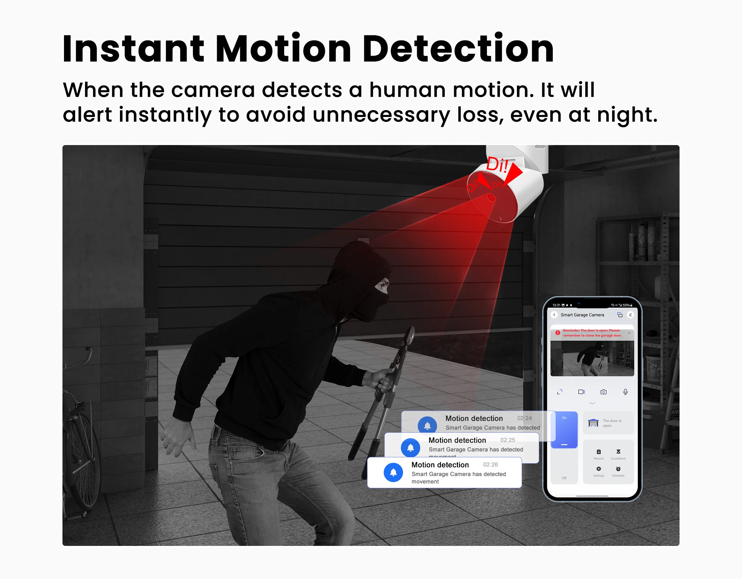 Keep an eye on your garage with our 1080P smart camera. Equipped with live video, playback, night vision, and motion detection functions, this home security camera allows for real-time monitoring of your garage and surrounding areas, giving you a clear and comforting view.